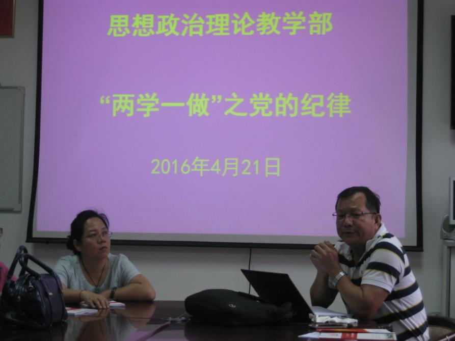 随后,老师们围绕中央办公厅“两学一做”学习教育专题方案和肖博士的辅导进行了讨论,大家认为我党这几年严抓党纪,对于加强党的建设,密切党群关系,巩固党的领导具有重大意义;表示思政课教师遵守党纪重点体现在“两课”教学中,体现在课堂上,体现在与员工的交往中,老师首先要管好自己。有老师提出要优化微信政治生态,要在微信群落弘扬正能量,既要反右,又要反左,不传谣言和封建迷信。