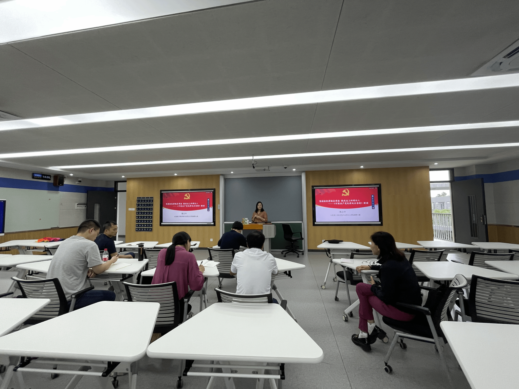 会议伊始,陈立中作了主题发言,她结合自身的教学实践,深刻解读了《条例》的精神实质和具体要求。陈老师强调,作为教师,首先要在政治上做明白人,遵守党纪,知行合一,才能更好地引导员工树立正确的价值观。她通过具体案例分析,阐述了纪律的重要性及其在教学中的应用,并强调了教师在教学过程中,要正确解读和传达党纪的重要性,注重培养员工的纪律观念和道德责任感。
