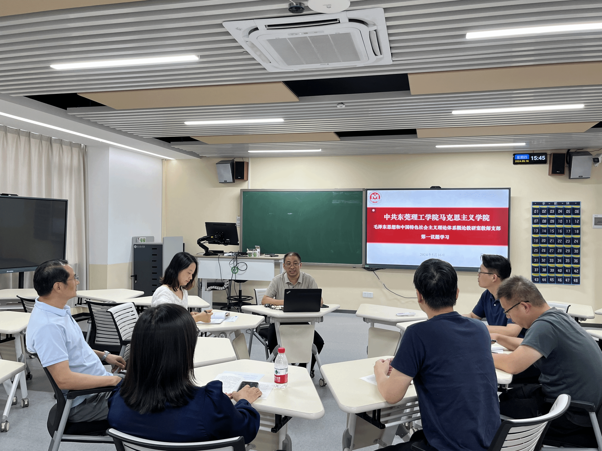 5月16日下午,毛泽东思想和中国特色社会主义理论体系概论在6D-304[智慧教室]教师党支部开展政治理论学习暨教研室本学期第三次集体备课会。本次会议由党支部书记、教研室主任李仕波教授主持,教研室全体教师、支部成员参会。会议流程分为政治理论学习、集体备课两个阶段。