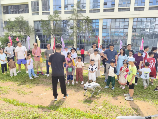 活动现场,10台无人机编队飞行表演和无人机空中烟弹展示精彩开场,瞬间点燃孩子们的热情。紧接着,“穿越机” 闪亮登场,灵活穿梭、快速翻腾,做出各种高难度动作,引得现场老师和家长惊叹连连,直呼过瘾。随后宇树科技机器狗的亮相更是将现场氛围推向高潮。在专业人员的讲解下,小朋友们全神贯注地学习无人机操作知识,并分组学习无人机飞行控制技巧。在家长的协助下,孩子们认真操控无人机完成起飞、悬停、转向,现场欢声笑语不断。